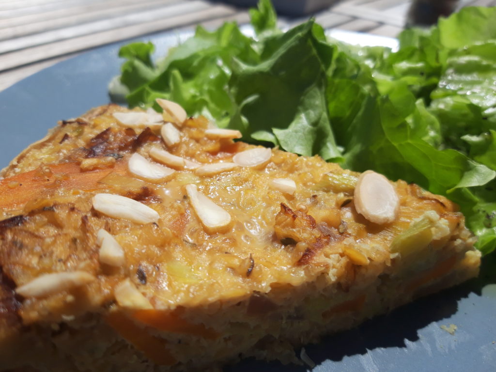 Dans cette galette on retrouve des légumes bio. Aujourd’hui ce sera carottes, poireaux, oignons. Mais vous pourrez improviser selon vos envies et les légumes de saison que vous trouverez. Côté féculent il s’agit d’un mélange de quinoa et de lentilles corail. Un mélange sans gluten de blé et plus riche en protéines qu’avec les céréales habituelles. Les œufs complètent l’apport protéique. Et le lait d’amande évite l’utilisation de lait de vache. Pour parfumer allez-y à votre guise. Pour nous ce sera menthe fraiche du jardin !