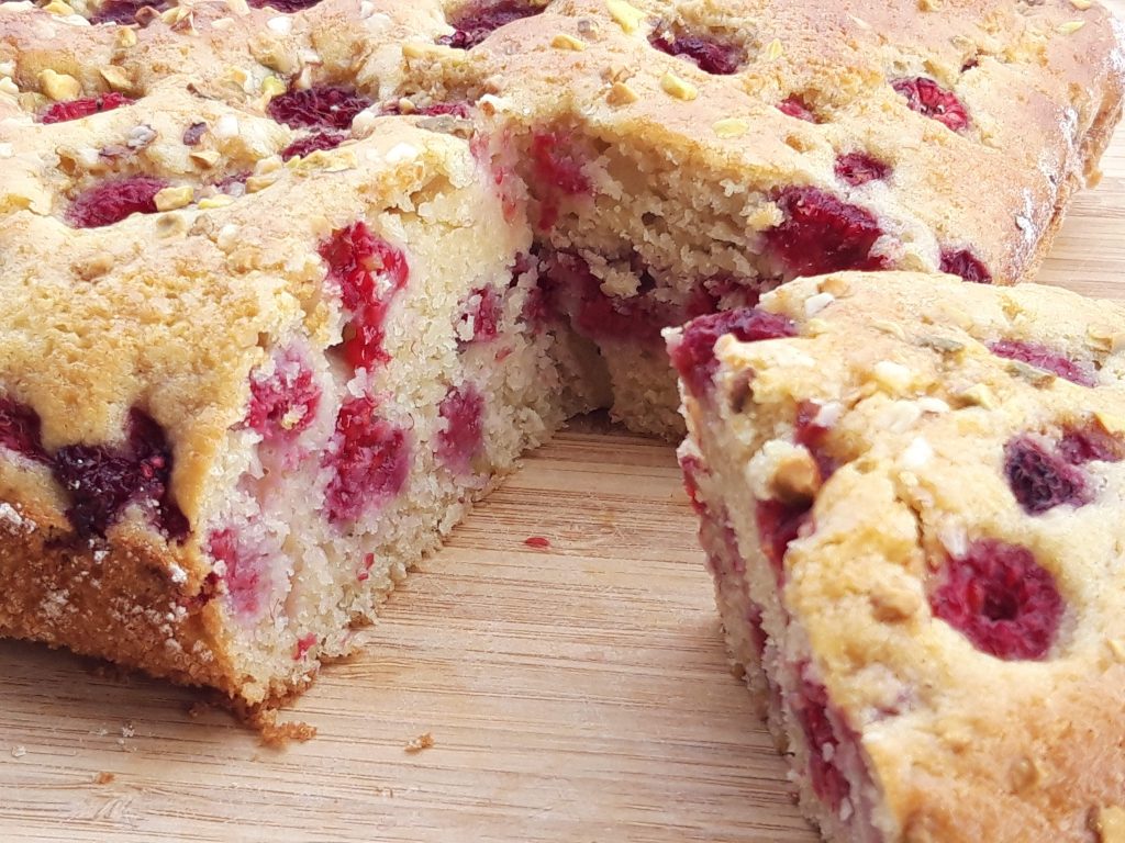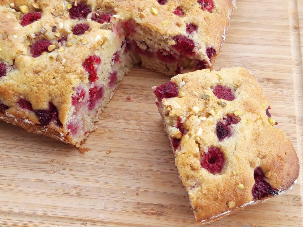 Et bien puisque j’ai du coulis de framboises maison, rien de mieux qu’un filet de coulis sur une bonne part de gâteau pour profiter pleinement des saveurs fruitées.