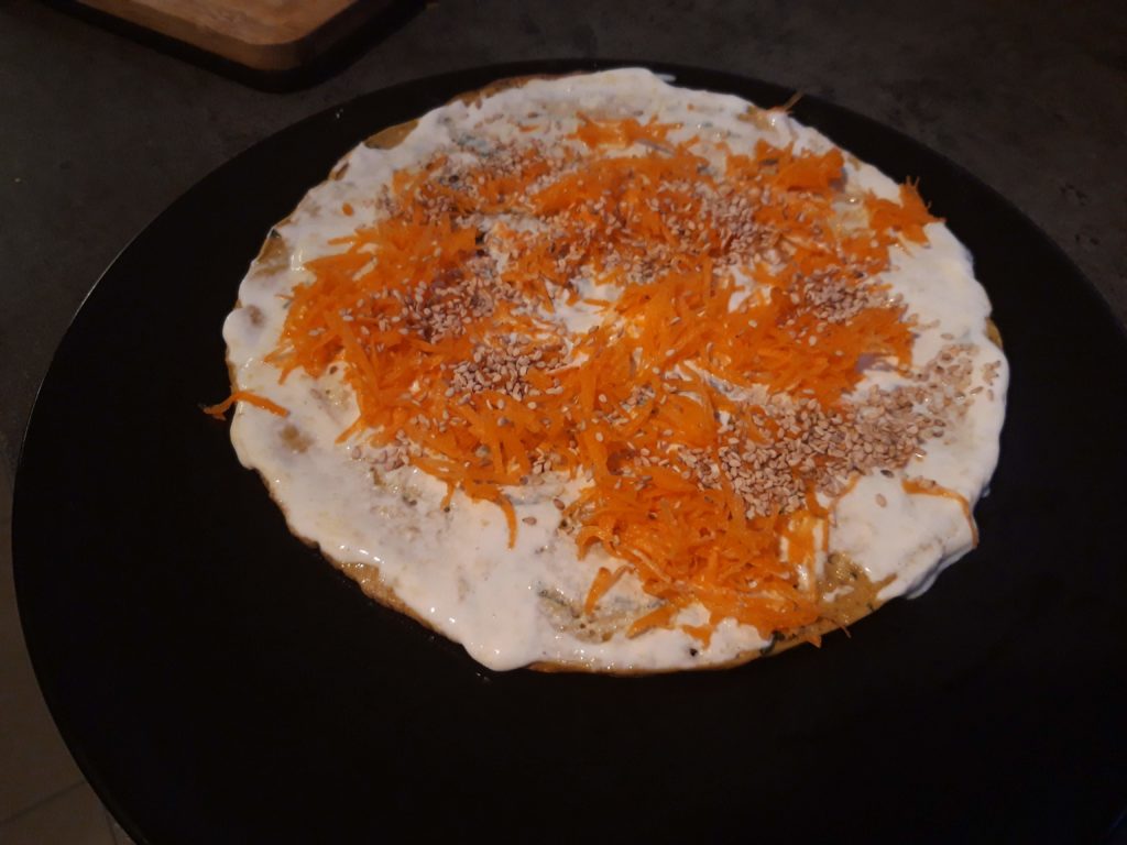 - Une fois l’omelette cuite, la déposer sur une assiette plate, la recouvrir du fromage blanc de brebis, du zest de citron, d’un peu de carottes râpée et de graines de sésame